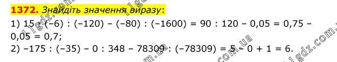Знайдіть значення виразу: 1) 15 ∙ (–6) : (–120) – (–80) : (–1600) = 90 : 120 – 0,05 = 0,75 – 0,05 = 0,7; 2) –175 : (–35) – 0 : 348 – 78309 : (–78309) = 5 – 0 + 1 = 6.