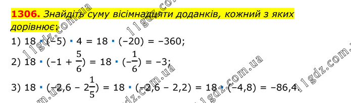 Знайдіть суму вісімнадцяти доданків, кожний з яких дорівнює: 1) 18 ∙ (–5) ∙ 4 = 18 ∙ (–20) = –360; 2) 18 ∙ (–1 + 5/6) = 18 ∙ (–1/6) = –3; 3) 18 ∙ (–2,6 – 21/5) = 18 ∙ (–2,6 – 2,2) = 18 ∙ (–4,8) = –86,4.