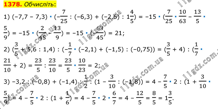Обчисліть: 1) (–7,7 – 7,3) ∙ (–7/25 : (–6,3) + (–2,6) : 14/5) = –15 ∙ (7/25 ∙ 10/63 – 13/5 ∙ 5/9) = –15 ∙ (2/45 – 13/9) = –15 ∙ (–63/45) = 21; 2) (3/5 + 5,6 : 1,4) : (–1/7 ∙ (–2,1) + (–1,5) : (–0,75)) = (3/5 + 4) : (1/7 ∙ 21/10 + 2) = 23/5 : 23/10 = 23/5 ∙ 10/23 = 2; 3) –3,2 : (–0,8) + (–1,4) : 1/2 : (1 – 3/10 : (–1,8)) = 4 – 7/5 ∙ 2 : (1 + 3/10 ∙ 5/9) = 4 – 7/5 ∙ 2 : (1 + 1/6) = 4 – 7/5 ∙ 2 ∙ 6/7 = 4 – 12/5 = 8/5 = 13/5.