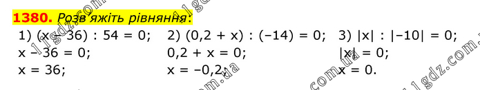 Розв’яжіть рівняння: 1) (х – 36) : 54 = 0; х – 36 = 0; х = 36; 2) (0,2 + х) : (–14) = 0; 0,2 + х = 0; х = –0,2; 3) |х| : |–10| = 0; |х| = 0; х = 0.