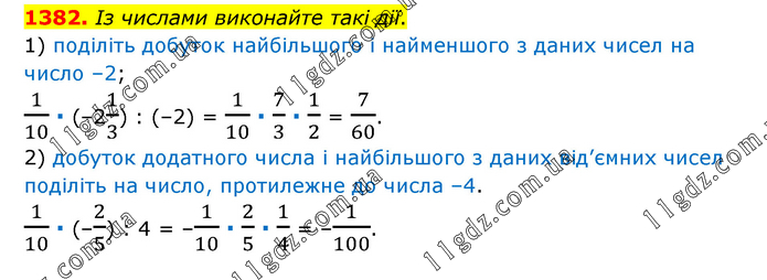 Із числами виконайте такі дії. 1) поділіть добуток найбільшого і найменшого з даних чисел на число –2; 1/10 ∙ (–21/3) : (–2) = 1/10 ∙ 7/3 ∙ 1/2 = 7/60. 2) добуток додатного числа і найбільшого з даних від’ємних чисел поділіть на число, протилежне до числа –4. 1/10 ∙ (–2/5) : 4 = –1/10 ∙ 2/5 ∙ 1/4 = –1/100.