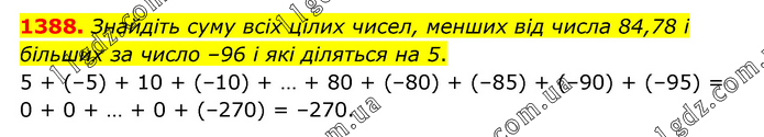 Знайдіть суму всіх цілих чисел, менших від числа 84,78 і більших за число –96 і які діляться на 5. 5 + (–5) + 10 + (–10) + … + 80 + (–80) + (–85) + (–90) + (–95) = 0 + 0 + … + 0 + (–270) = –270.