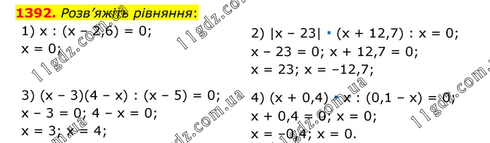 Розв’яжіть рівняння: 1) х : (х – 2,6) = 0; х = 0; 2) |х – 23| ∙ (х + 12,7) : х = 0; х – 23 = 0; х + 12,7 = 0; х = 23; х = –12,7; 3) (х – 3)(4 – х) : (х – 5) = 0; х – 3 = 0; 4 – х = 0; х = 3; х = 4; 4) (х + 0,4) ∙ х : (0,1 – х) = 0; х + 0,4 = 0; х = 0; х = –0,4; х = 0.