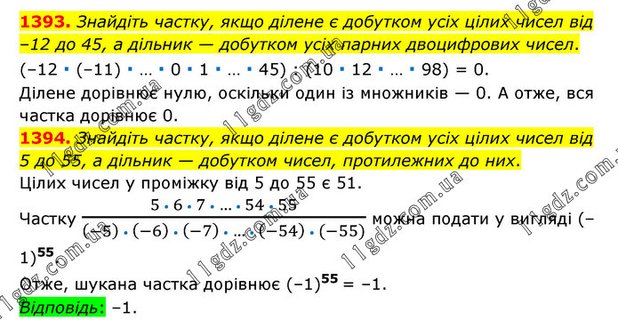 1393. Знайдіть частку, якщо ділене є добутком усіх цілих чисел від –12 до 45, а дільник — добутком усіх парних двоцифрових чисел. (–12 ∙ (–11) ∙ … ∙ 0 ∙ 1 ∙ … ∙ 45) : (10 ∙ 12 ∙ … ∙ 98) = 0. Ділене дорівнює нулю, оскільки один із множників — 0. А отже, вся частка дорівнює 0. 1394. Знайдіть частку, якщо ділене є добутком усіх цілих чисел від 5 до 55, а дільник — добутком чисел, протилежних до них. Цілих чисел у проміжку від 5 до 55 є 51. Частку (5 • 6 • 7 • … • 54 • 55)/((-5) • (-6) • (-7) • … • (-54) • (-55)) можна подати у вигляді (–1)55. Отже, шукана частка дорівнює (–1)55 = –1. Відповідь: –1.