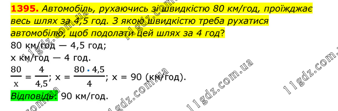 Автомобіль, рухаючись зі швидкістю 80 км/год, проїжджає весь шлях за 4,5 год. З якою швидкістю треба рухатися автомобілю, щоб подолати цей шлях за 4 год? 80 км/год — 4,5 год; х км/год — 4 год. 80/х = 4/4,5; х = (80 • 4,5)/4; х = 90 (км/год). Відповідь: 90 км/год.