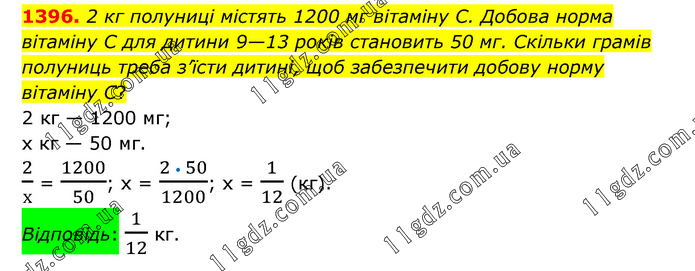 2 кг полуниці містять 1200 мг вітаміну С. Добова норма вітаміну C для дитини 9—13 років становить 50 мг. Скільки грамів полуниць треба з’їсти дитині, щоб забезпечити добову норму вітаміну С? 2 кг — 1200 мг; х кг — 50 мг. 2/х = 1200/50; х = (2 • 50)/1200; х = 1/12 (кг). Відповідь: 1/12 кг.
