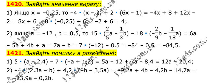 1420. Знайдіть значення виразу: 1) Якщо x = –0,25, то –4 ∙ (x – 2) + 2 ∙ (6x – 1) = –4x + 8 + 12x – 2 = 8x + 6 = 8 ∙ (–0,25) + 6 = –2 + 6 = 4; 2) якщо a = –12 , b = 0,5, то 15 ∙ (2/5a – 1/3b) – 18 ∙ (–2/9b – 1/18a) = 6a – 5b + 4b + a = 7a – b = 7 ∙ (–12) – 0,5 = –84 – 0,5 = –84,5. 1421. Знайдіть помилку в розв’язанні: 1) 5 ∙ (a – 2,4) – 7 ∙ (–a + 1,2) = 5a – 12 + 7a – 8,4 = 12a – 20,4; 2) –4 ∙ (2,3a – b) + 4,2 ∙ (–b – 3,5a) = –9,2a + 4b – 4,2b – 14,7a = = –23,9a – 0,2b.