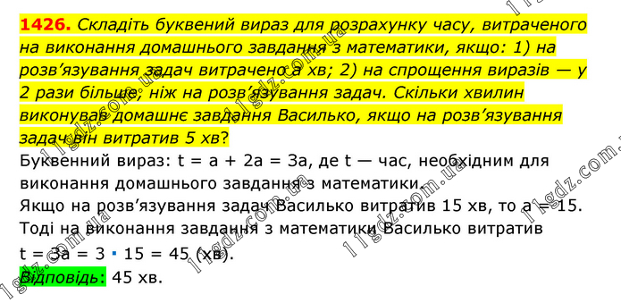 Складіть буквений вираз для розрахунку часу, витраченого на виконання домашнього завдання з математики, якщо: 1) на розв’язування задач витрачено a хв; 2) на спрощення виразів — у 2 рази більше, ніж на розв’язування задач. Скільки хвилин виконував домашнє завдання Василько, якщо на розв’язування задач він витратив 5 хв? Буквенний вираз: t = а + 2а = За, де t — час, необхідним для виконання домашнього завдання з математики. Якщо на розв’язування задач Василько витратив 15 хв, то а = 15. Тоді на виконання завдання з математики Василько витратив t = За = 3 ∙ 15 = 45 (хв). Відповідь: 45 хв.