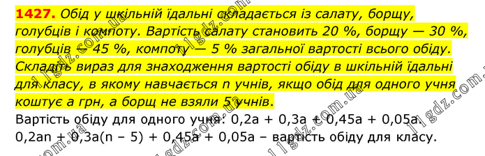 Обід у шкільній їдальні складається із салату, борщу, голубців і компоту. Вартість салату становить 20 %, борщу — 30 %, голубців — 45 %, компоту — 5 % загальної вартості всього обіду. Складіть вираз для знаходження вартості обіду в шкільній їдальні для класу, в якому навчається n учнів, якщо обід для одного учня коштує а грн, а борщ не взяли 5 учнів. Вартість обіду для одного учня: 0,2а + 0,3а + 0,45а + 0,05а. 0,2an + 0,3a(n – 5) + 0,45а + 0,05а – вартість обіду для класу.