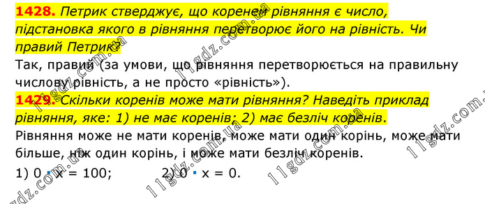 1428. Петрик стверджує, що коренем рівняння є число, підстановка якого в рівняння перетворює його на рівність. Чи правий Петрик? Так, правий (за умови, що рівняння перетворюється на правильну числову рівність, а не просто «рівність»). 1429. Скільки коренів може мати рівняння? Наведіть приклад рівняння, яке: 1) не має коренів; 2) має безліч коренів. Рівняння може не мати коренів, може мати один корінь, може мати більше, ніж один корінь, і може мати безліч коренів. 1) 0 ∙ х = 100; 2) 0 ∙ х = 0.