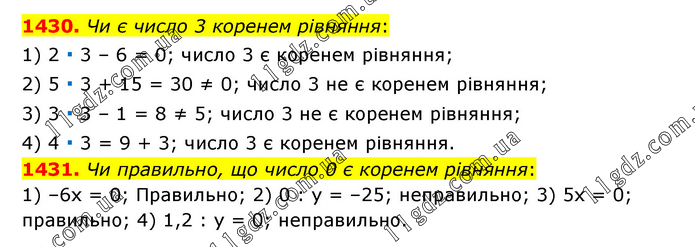 1430. Чи є число 3 коренем рівняння: 1) 2 ∙ 3 – 6 = 0; число 3 є коренем рівняння; 2) 5 ∙ 3 + 15 = 30 ≠ 0; число 3 не є коренем рівняння; 3) 3 ∙ 3 – 1 = 8 ≠ 5; число 3 не є коренем рівняння; 4) 4 ∙ 3 = 9 + 3; число 3 є коренем рівняння. 1431. Чи правильно, що число 0 є коренем рівняння: 1) –6х = 0; Правильно; 2) 0 : у = –25; неправильно; 3) 5х = 0; правильно; 4) 1,2 : у = 0; неправильно.