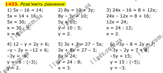 Розв’яжіть рівняння: 1) 5x – 16 = 14; 5x = 14 + 16; 5x = 30; x = 30 : 5; x = 6. 2) 8y = 10 + 3y; 8y – 3y = 10; 5y = 10; y = 10 : 5; y = 2. 3) 24x – 16 = 8 + 12x; 24x – 12x = 8 + 16; 12x = 24; x = 24 : 12; x = 2. 4) 12 – y = 2y + 6; –y – 2y = –12 + 6; –3y = –6; y = –6 : (–3); y = 2. 5) 3x + 3 = 27 – 5x; 3x + 5x = 27 – 3; 8x = 24; x = 24 : 8; x = 3. 6) –3y – 8 = 2y + 7; –3y – 2y = 7 + 8; –5y = 15; y = 15 : (–5); y = –3.
