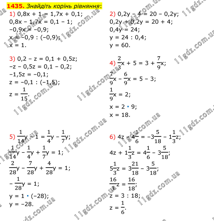 Знайдіть корінь рівняння: 1) 0,8x + 1 = 1,7x + 0,1; 0,8x – 1,7x = 0,1 – 1; –0,9x = –0,9; x = –0,9 : (–0,9); x = 1. 2) 0,2y – 4 = 20 – 0,2y; 0,2y + 0,2y = 20 + 4; 0,4y = 24; y = 24 : 0,4; y = 60. 3) 0,2 – z = 0,1 + 0,5z; –z – 0,5z = 0,1 – 0,2; –1,5z = –0,1; z = –0,1 : (–1,5); z = 1/15. 4) 2/3x + 5 = 3 + 7/9x; 7/9x – 6/9x = 5 – 3; 1/9x = 2; x = 2 ∙ 9; x = 18. 5) 1/14y – 1 = 1/4y – 1/7y; 1/14y – 1/4y + 1/7y = 1; 2/28y – 7/28y + 4/28y = 1; – 1/28y = 1; y = 1 ∙ (–28); y = –28. 6) 4z – 41/6 = –35/18 – 11/3z; 4z + 11/3z = 41/6 – 35/18; 51/3z = 321/18 – 35/18; 16/3z = 16/18; z = 3 : 18; z = 1/6.