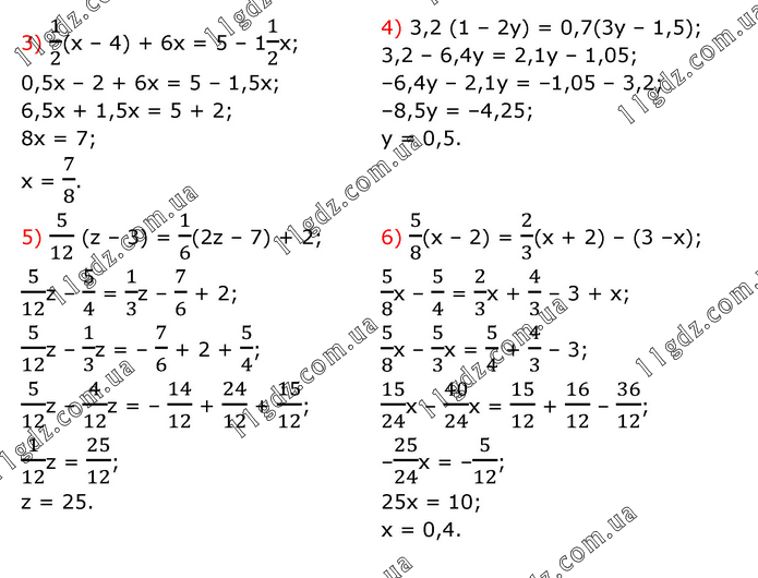 3) 1/2(х – 4) + 6х = 5 – 11/2х; 0,5х – 2 + 6х = 5 – 1,5х; 6,5х + 1,5х = 5 + 2; 8х = 7; х = 7/8. 4) 3,2 (1 – 2у) = 0,7(3у – 1,5); 3,2 – 6,4у = 2,1у – 1,05; –6,4у – 2,1у = –1,05 – 3,2; –8,5у = –4,25; у = 0,5. 5) 5/12 (z – 3) = 1/6(2z – 7) + 2; 5/12z – 5/4 = 1/3z – 7/6 + 2; 5/12z – 1/3z = – 7/6 + 2 + 5/4; 5/12z – 4/12z = – 14/12 + 24/12 + 15/12; 1/12z = 25/12; z = 25. 6) 5/8(x – 2) = 2/3(x + 2) – (3 –x); 5/8x – 5/4 = 2/3x + 4/3 – 3 + x; 5/8x – 5/3x = 5/4 + 4/3 – 3; 15/24x – 40/24x = 15/12 + 16/12 – 36/12; –25/24x = –5/12; 25x = 10; x = 0,4.
