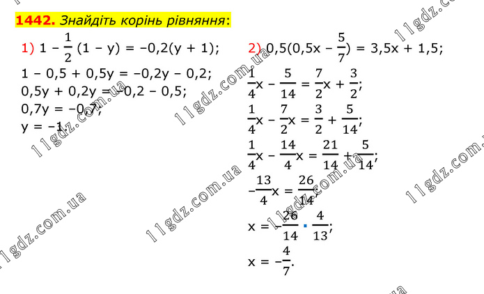 Знайдіть корінь рівняння: 1) 1 – 1/2 (1 – y) = –0,2(y + 1); 1 – 0,5 + 0,5y = –0,2y – 0,2; 0,5y + 0,2y = –0,2 – 0,5; 0,7y = –0,7; y = –1. 2) 0,5(0,5x – 5/7) = 3,5x + 1,5; 1/4x – 5/14 = 7/2x + 3/2; 1/4x – 7/2x = 3/2 + 5/14; 1/4x – 14/4x = 21/14 + 5/14; –13/4x = 26/14; x = –26/14 ∙ 4/13; x = –4/7.