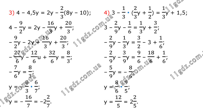 3) 4 – 4,5y = 2y – 2/3(8y – 10); 4 – 9/2y = 2y – 16/3y + 20/3; – 9/2y – 2y + 16/3y + 20/3; – 27/6y – 12/6u + 32/6y = 8/3; – 7/6y = 8/3; y = – 8/3 ∙ 6/7; y = – 16/7 = –22/7. 4) 3 – 1/3 ∙ (2/3y + 1/2) = 1/3y + 1,5; 3 – 2/9y – 1/6 = 1/3y + 3/2; – 2/9y – 1/3y = 3/2 – 3 + 1/6; – 2/9y – 3/9y = 9/6 – 18/6 + 1/6; – 5/9y = – 8/6; y = 8/6 ∙ 9/5; y = 12/5 = 22/5.