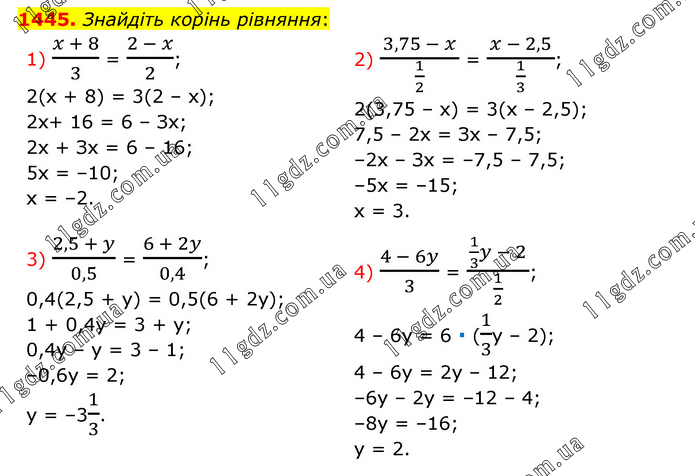 Знайдіть корінь рівняння: 1) (x + 8)/3 = (2 - x)/2; 2(х + 8) = 3(2 – х); 2х+ 16 = 6 – Зх; 2х + Зх = 6 – 16; 5х = –10; х = –2. 2) (3,75 - x)/(1/2) = (x - 2,5)/(1/3); 2(3,75 – х) = 3(х – 2,5); 7,5 – 2х = Зх – 7,5; –2х – Зх = –7,5 – 7,5; –5х = –15; х = 3. 3) (2,5 + y)/0,5 = (6 + 2y)/0,4; 0,4(2,5 + у) = 0,5(6 + 2у); 1 + 0,4у = 3 + у; 0,4у – у = 3 – 1; –0,6у = 2; y = –31/3. 4) (4 - 6y)/3 = (1/3 y - 2)/(1/2); 4 – 6y = 6 ∙ (1/3y – 2); 4 – 6у = 2у – 12; –6у – 2у = –12 – 4; –8у = –16; y = 2.