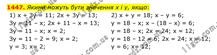 Якими можуть бути значення х і у, якщо: 1) х + Зу = 11; 2х + 3у = 13; Зу = 11 – х; 2х + 11 – х = 13; Зу = 11 – х; х = 2; Зу = 11 – 2 = 9; х = 2; у = 3; х= 2; 2) х + у = 18; х – у = 6; у = 18 – х; х – (18 – х) = 6; у = 18 – х; 2х = 24; х = 12; у = 18 – 12 = 6; 2х = 24; х = 12; у = 6; х= 12;