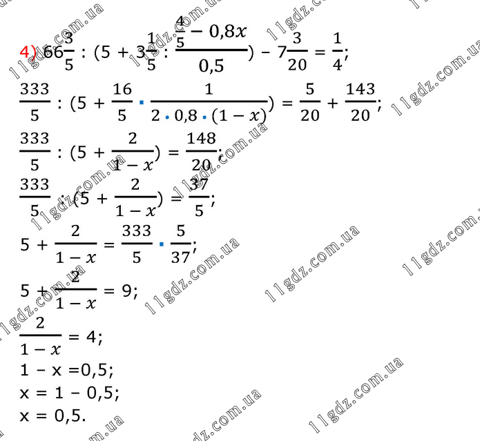 4) 663/5 : (5 + 31/5 : (4/5 - 0,8x)/0,5) – 73/20 = 1/4; 333/5 : (5 + 16/5 ∙ 1/(2 • 0,8 • (1 - x))) = 5/20 + 143/20; 333/5 : (5 + 2/(1 - x)) = 148/20; 333/5 : (5 + 2/(1 - x)) = 37/5; 5 + 2/(1 - x) = 333/5 ∙ 5/37; 5 + 2/(1 - x) = 9; 2/(1 - x) = 4; 1 – х =0,5; х = 1 – 0,5; х = 0,5.