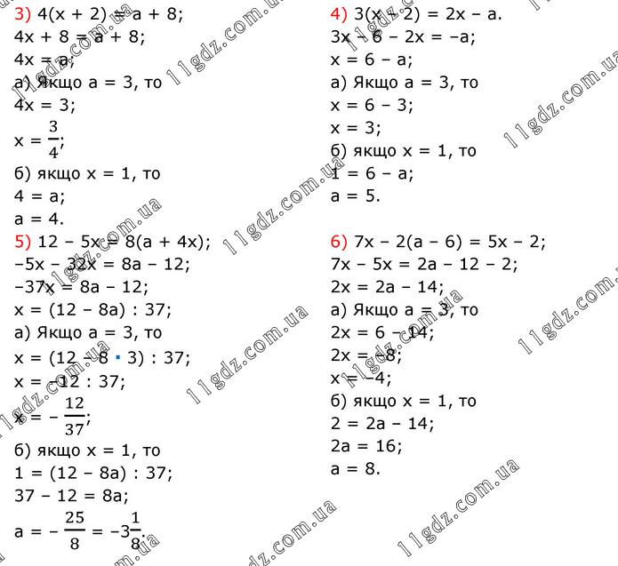 3) 4(х + 2) = а + 8; 4х + 8 = а + 8; 4х = а; а) Якщо а = 3, то 4х = 3; х = 3/4; б) якщо х = 1, то 4 = а; а = 4. 4) 3(х – 2) = 2х – а. 3х – 6 – 2х = –а; х = 6 – а; а) Якщо а = 3, то х = 6 – 3; х = 3; б) якщо х = 1, то 1 = 6 – а; а = 5. 5) 12 – 5х = 8(а + 4х); –5х – 32х = 8а – 12; –37х = 8а – 12; х = (12 – 8а) : 37; а) Якщо а = 3, то х = (12 – 8 ∙ 3) : 37; х = –12 : 37; х = – 12/37; б) якщо х = 1, то 1 = (12 – 8а) : 37; 37 – 12 = 8а; а = – 25/8 = –31/8. 6) 7х – 2(а – 6) = 5х – 2; 7х – 5х = 2а – 12 – 2; 2х = 2а – 14; а) Якщо а = 3, то 2х = 6 – 14; 2х = –8; х = –4; б) якщо х = 1, то 2 = 2а – 14; 2а = 16; а = 8.