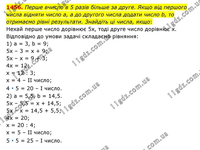 Перше вчисло в 5 разів більше за друге. Якщо від першого числа відняти число a, а до другого числа додати число b, то отримаємо рівні результати. Знайдіть ці числа, якщо: Нехай перше число дорівнює 5х, тоді друге число дорівнює х. Відповідно до умови задачі складаємо рівняння: 1) a = 3, b = 9; 5х – 3 = х + 9; 5х – х = 9 + 3; 4х = 12; х = 12 : 3; х = 4 – ІІ число; 4 ∙ 5 = 20 – І число. 2) a = 5,5, b = 14,5. 5х – 5,5 = х + 14,5; 5х – х = 14,5 + 5,5; 4х = 20; х = 20 : 4; х = 5 – ІІ число; 5 ∙ 5 = 25 – І число.