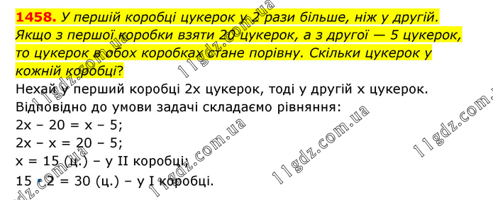 У першій коробці цукерок у 2 рази більше, ніж у другій. Якщо з першої коробки взяти 20 цукерок, а з другої — 5 цукерок, то цукерок в обох коробках стане порівну. Скільки цукерок у кожній коробці? Нехай у перший коробці 2х цукерок, тоді у другій х цукерок. Відповідно до умови задачі складаємо рівняння: 2х – 20 = х – 5; 2х – х = 20 – 5; х = 15 (ц.) – у ІІ коробці; 15 ∙ 2 = 30 (ц.) – у І коробці.