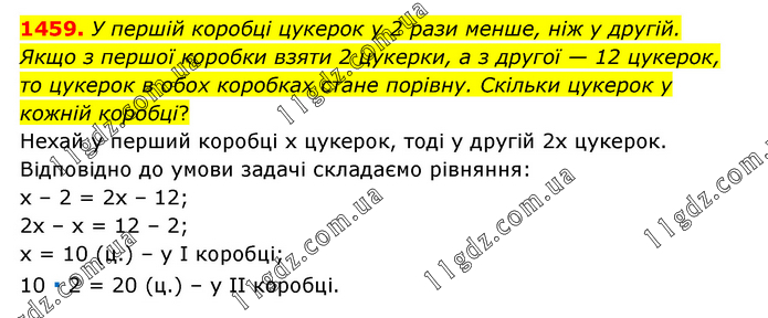 У першій коробці цукерок у 2 рази менше, ніж у другій. Якщо з першої коробки взяти 2 цукерки, а з другої — 12 цукерок, то цукерок в обох коробках стане порівну. Скільки цукерок у кожній коробці? Нехай у перший коробці х цукерок, тоді у другій 2х цукерок. Відповідно до умови задачі складаємо рівняння: х – 2 = 2х – 12; 2х – х = 12 – 2; х = 10 (ц.) – у І коробці; 10 ∙ 2 = 20 (ц.) – у ІІ коробці.