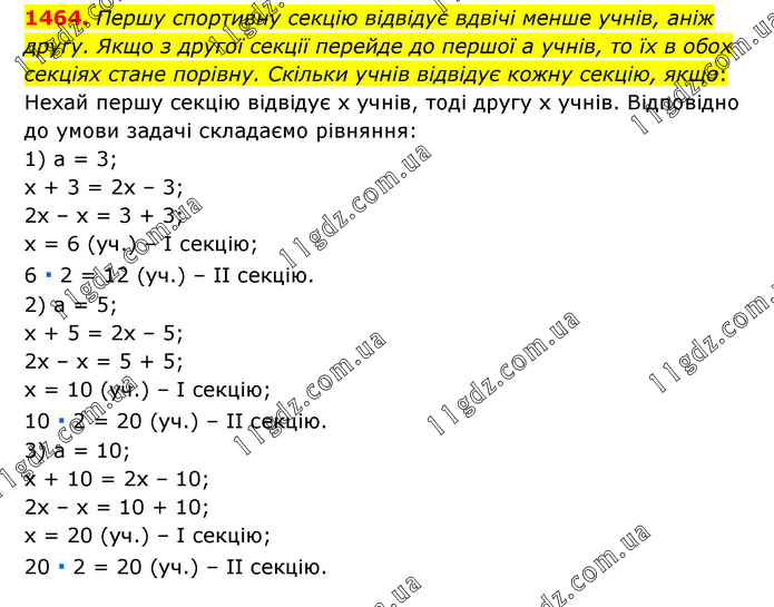 Першу спортивну секцію відвідує вдвічі менше учнів, аніж другу. Якщо з другої секції перейде до першої а учнів, то їх в обох секціях стане порівну. Скільки учнів відвідує кожну секцію, якщо: Нехай першу секцію відвідує х учнів, тоді другу х учнів. Відповідно до умови задачі складаємо рівняння: 1) а = 3; х + 3 = 2х – 3; 2х – х = 3 + 3; х = 6 (уч.) – І секцію; 6 ∙ 2 = 12 (уч.) – ІІ секцію. 2) а = 5; х + 5 = 2х – 5; 2х – х = 5 + 5; х = 10 (уч.) – І секцію; 10 ∙ 2 = 20 (уч.) – ІІ секцію. 3) а = 10; х + 10 = 2х – 10; 2х – х = 10 + 10; х = 20 (уч.) – І секцію; 20 ∙ 2 = 20 (уч.) – ІІ секцію.