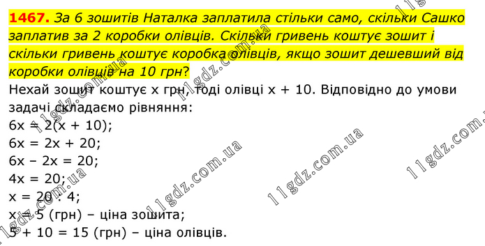 За 6 зошитів Наталка заплатила стільки само, скільки Сашко заплатив за 2 коробки олівців. Скільки гривень коштує зошит і скільки гривень коштує коробка олівців, якщо зошит дешевший від коробки олівців на 10 грн? Нехай зошит коштує х грн, тоді олівці х + 10. Відповідно до умови задачі складаємо рівняння: 6х = 2(х + 10); 6х = 2х + 20; 6х – 2х = 20; 4х = 20; х = 20 : 4; х = 5 (грн) – ціна зошита; 5 + 10 = 15 (грн) – ціна олівців.