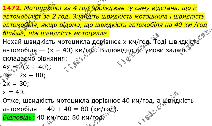 Мотоцикліст за 4 год проїжджає ту саму відстань, що й автомобіліст за 2 год. Знайдіть швидкість мотоцикла і швидкість автомобіля, якщо відомо, що швидкість автомобіля на 40 км /год більша, ніж швидкість мотоцикла. Нехай швидкість мотоцикла дорівнює х км/год. Тоді швидкість автомобіля — (х + 40) км/год. Відповідно до умови задачі складаємо рівняння: 4х = 2(х + 40); 4х = 2х + 80; 2х = 80; х = 40. Отже, швидкість мотоцикла дорівнює 40 км/год, а швидкість автомобіля — 40 + 40 = 80 (км/год). Відповідь: 40 км/год; 80 км/год.