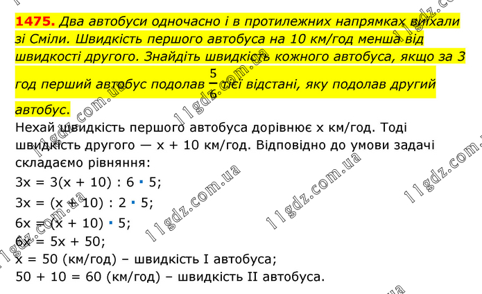 Два автобуси одночасно і в протилежних напрямках виїхали зі Сміли. Швидкість першого автобуса на 10 км/год менша від швидкості другого. Знайдіть швидкість кожного автобуса, якщо за 3 год перший автобус подолав 5/6 тієї відстані, яку подолав другий автобус. Нехай швидкість першого автобуса дорівнює х км/год. Тоді швидкість другого — х + 10 км/год. Відповідно до умови задачі складаємо рівняння: 3х = 3(х + 10) : 6 ∙ 5; 3х = (х + 10) : 2 ∙ 5; 6х = (х + 10) ∙ 5; 6х = 5х + 50; х = 50 (км/год) – швидкість І автобуса; 50 + 10 = 60 (км/год) – швидкість ІІ автобуса.