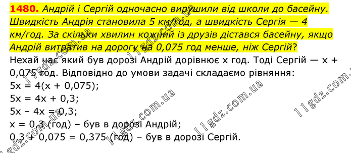 Андрій і Сергій одночасно вирушили від школи до басейну. Швидкість Андрія становила 5 км/год, а швидкість Сергія — 4 км/год. За скільки хвилин кожний із друзів дістався басейну, якщо Андрій витратив на дорогу на 0,075 год менше, ніж Сергій? Нехай час який був дорозі Андрій дорівнює х год. Тоді Сергій — х + 0,075 год. Відповідно до умови задачі складаємо рівняння: 5х = 4(х + 0,075); 5х = 4х + 0,3; 5х – 4х = 0,3; х = 0,3 (год) – був в дорозі Андрій; 0,3 + 0,075 = 0,375 (год) – був в дорозі Сергій.