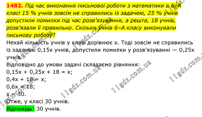 Під час виконання письмової роботи з математики в 6–А класі 15 % учнів зовсім не справились із задачею, 25 % учнів допустили помилки під час розв’язування, а решта, 18 учнів, розв’язали її правильно. Скільки учнів 6–А класу виконували письмову роботу? Нехай кількість учнів у класі дорівнює х. Тоді зовсім не справились із задачею 0,15х учнів, допустили помилки у розв’язуванні — 0,25х учнів. Відповідно до умови задачі складаємо рівняння: 0,15х + 0,25х + 18 = х; 0,4х + 18 = х; 0,6х = 18; х = 30. Отже, у класі 30 учнів. Відповідь: 30 учнів.