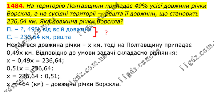 На територію Полтавщини припадає 49% усієї довжини річки Ворскла, а на сусідні території — решта її довжини, що становить 236,64 км. Яка довжина річки Ворскла? П. – ?, 49% від всій довжини С. – 236,64 км, решта Нехай вся довжина річки – х км, тоді на Полтавщину припадає 0,49х км. Відповідно до умови задачі складаємо рівняння: х – 0,49х = 236,64; 0,51х = 236,64; х = 236,64 : 0,51; х = 464 (км) – довжина річки Ворскла.