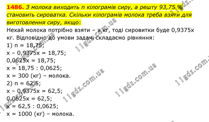 З молока виходить n кілограмів сиру, а решту 93,75 % становить сироватка. Скільки кілограмів молока треба взяти для виготовлення сиру, якщо: Нехай молока потрібно взяти – х кг, тоді сировитки буде 0,9375х кг. Відповідно до умови задачі складаємо рівняння: 1) n = 18,75; х – 0,9375х = 18,75; 0,0625х = 18,75; х = 18,75 : 0,0625; х = 300 (кг) – молока. 2) n = 62,5; х – 0,9375х = 62,5; 0,0625х = 62,5; х = 62,5 : 0,0625; х = 1000 (кг) – молока.