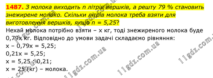 З молока виходить n літрів вершків, а решту 79 % становить знежирене молоко. Скільки літрів молока треба взяти для виготовлення вершків, якщо n = 5,25? Нехай молока потрібно взяти – х кг, тоді знежиреного молока буде 0,79х кг. Відповідно до умови задачі складаємо рівняння: х – 0,79х = 5,25; 0,21х = 5,25; х = 5,25 : 0,21; х = 25 (кг) – молока.