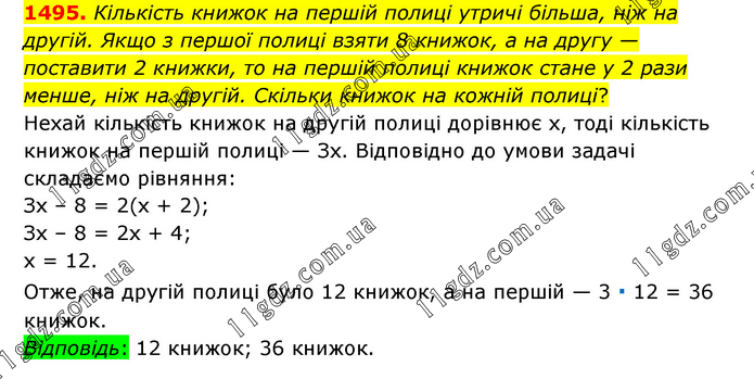 Кількість книжок на першій полиці утричі більша, ніж на другій. Якщо з першої полиці взяти 8 книжок, а на другу — поставити 2 книжки, то на першій полиці книжок стане у 2 рази менше, ніж на другій. Скільки книжок на кожній полиці? Нехай кількість книжок на другій полиці дорівнює х, тоді кількість книжок на першій полиці — Зх. Відповідно до умови задачі складаємо рівняння: Зх – 8 = 2(х + 2); Зх – 8 = 2х + 4; х = 12. Отже, на другій полиці було 12 книжок, а на першій — 3 ∙ 12 = 36 книжок. Відповідь: 12 книжок; 36 книжок.