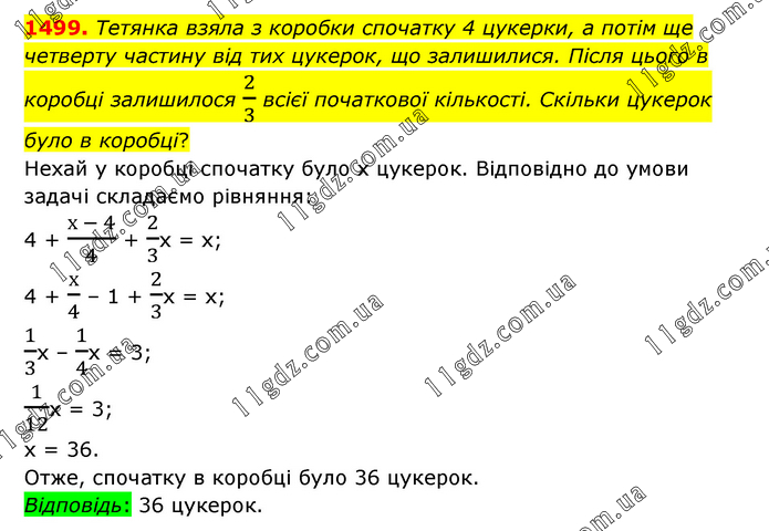 Тетянка взяла з коробки спочатку 4 цукерки, а потім ще четверту частину від тих цукерок, що залишилися. Після цього в коробці залишилося 2/3 всієї початкової кількості. Скільки цукерок було в коробці? Нехай у коробці спочатку було х цукерок. Відповідно до умови задачі складаємо рівняння: 4 + (х - 4)/4 + 2/3х = х; 4 + х/4 – 1 + 2/3х = х; 1/3х – 1/4х = 3; 1/12х = 3; х = 36. Отже, спочатку в коробці було 36 цукерок. Відповідь: 36 цукерок.