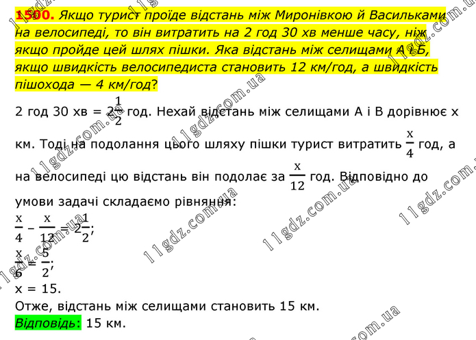 Якщо турист проїде відстань між Миронівкою й Васильками на велосипеді, то він витратить на 2 год 30 хв менше часу, ніж якщо пройде цей шлях пішки. Яка відстань між селищами А і Б, якщо швидкість велосипедиста становить 12 км/год, а швидкість пішохода — 4 км/год? 2 год 30 хв = 21/2 год. Нехай відстань між селищами А і В дорівнює х км. Тоді на подолання цього шляху пішки турист витратить х/4 год, а на велосипеді цю відстань він подолає за х/12 год. Відповідно до умови задачі складаємо рівняння: х/4 – х/12 = 21/2; х/6 = 5/2; х = 15. Отже, відстань між селищами становить 15 км. Відповідь: 15 км.
