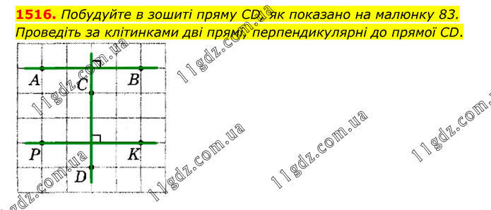 Побудуйте в зошиті пряму CD, як показано на малюнку 83. Проведіть за клітинками дві прямі, перпендикулярні до прямої CD.