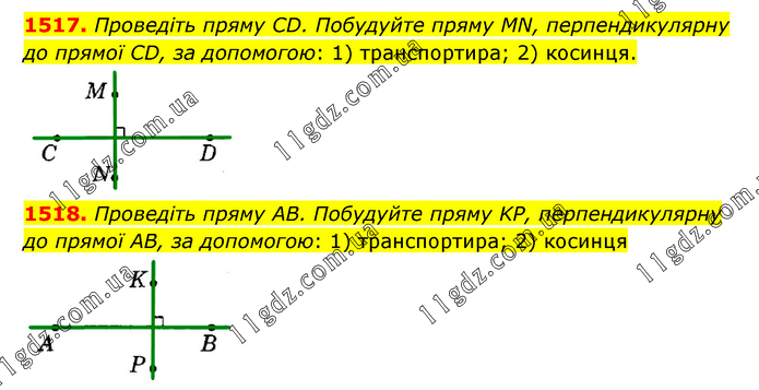 1517. Проведіть пряму CD. Побудуйте пряму MN, перпендикулярну до прямої CD, за допомогою: 1) транспортира; 2) косинця. 1518. Проведіть пряму AB. Побудуйте пряму KP, перпендикулярну до прямої AB, за допомогою: 1) транспортира; 2) косинця