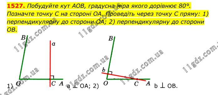 Побудуйте кут AOB, градусна міра якого дорівнює 80°. Позначте точку C на стороні OA. Проведіть через точку C пряму: 1) перпендикулярну до сторони OA; 2) перпендикулярну до сторони OB.