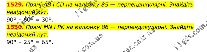 1529. Прямі AB і CD на малюнку 85 — перпендикулярні. Знайдіть невідомий кут. 90° – 60° = 30°. 1530. Прямі MN і PK на малюнку 86 — перпендикулярні. Знайдіть невідомий кут. 90° – 25° = 65°.