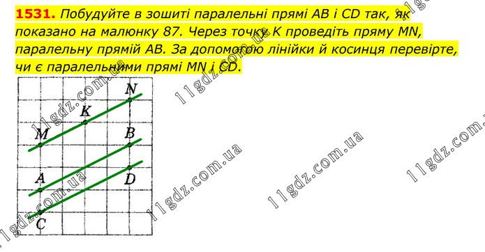 Побудуйте в зошиті паралельні прямі AB і CD так, як показано на малюнку 87. Через точку K проведіть пряму MN, паралельну прямій AB. За допомогою лінійки й косинця перевірте, чи є паралельними прямі MN і CD.