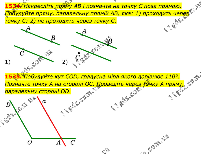 Накресліть пряму AB і позначте на точку C поза прямою. Побудуйте пряму, паралельну прямій AB, яка: 1) проходить через точку С; 2) не проходить через точку С. 1535. Побудуйте кут COD, градусна міра якого дорівнює 110°. Позначте точку А на стороні ОС. Проведіть через точку А пряму, паралельну стороні OD.