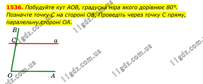 Побудуйте кут АОВ, градусна міра якого дорівнює 80°. Позначте точку C на стороні OB. Проведіть через точку C пряму, паралельну стороні OA.