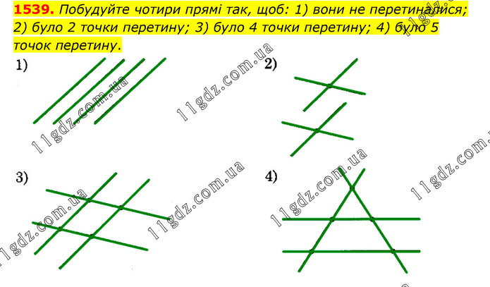 Побудуйте чотири прямі так, щоб: 1) вони не перетиналися; 2) було 2 точки перетину; 3) було 4 точки перетину; 4) було 5 точок перетину.
