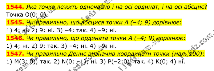 1544. Яка точка лежить одночасно і на осі ординат, і на осі абсцис? Точка О(0; 0). 1545. Чи правильно, що абсциса точки А (–4; 9) дорівнює: 1) 4; ні. 2) 9; ні. 3) –4; так. 4) –9; ні. 1546. Чи правильно, що ордината точки А (–4; 9) дорівнює: 1) 4; ні. 2) 9; так. 3) –4; ні. 4) –9; ні. 1547. Чи правильно Денис визначив координати точки (мал. 100): 1) M(3; 0); так. 2) N(0; –1); ні. 3) P(–2;0); так. 4) K(0; 4) ні.
