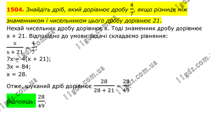 Знайдіть дріб, який дорівнює дробу 4/7, якщо різниця між знаменником і чисельником цього дробу дорівнює 21. Нехай чисельник дробу дорівнює х. Тоді знаменник дробу дорівнює х + 21. Відповідно до умови задачі складаємо рівняння: х/(х + 21) = 4/7; 7х = 4(х + 21); Зх = 84; х = 28. Отже, шуканий дріб дорівнює 28/(28 + 21) = 28/49. Відповідь: 28/49.