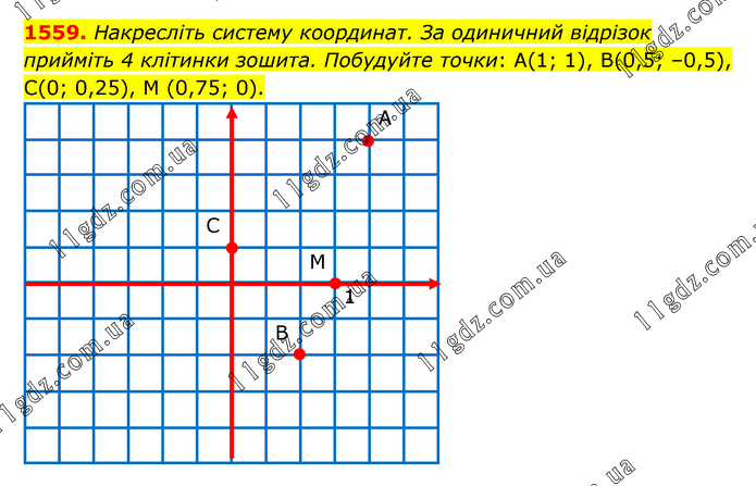 Накресліть систему координат. За одиничний відрізок прийміть 4 клітинки зошита. Побудуйте точки: А(1; 1), В(0,5; –0,5), С(0; 0,25), М (0,75; 0).